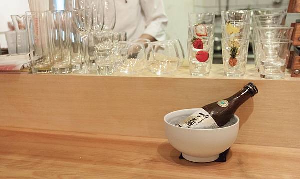 啤酒用很有古早雜貨店風格的玻璃杯裝盛 -