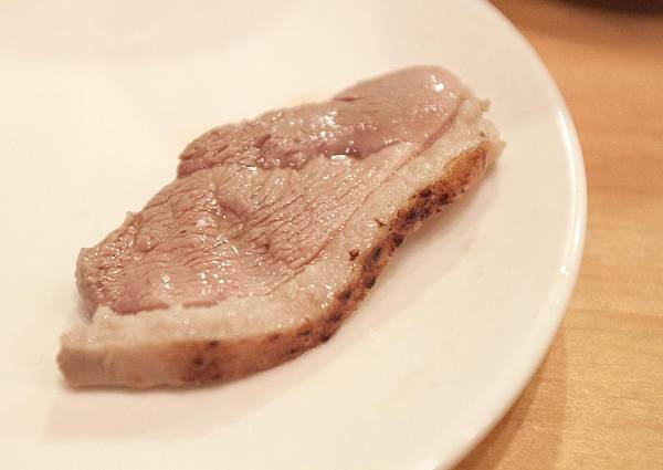 切成厚片的鴨肉已事先處理,略微烤上色的皮層似乎更能帶出油脂香 -